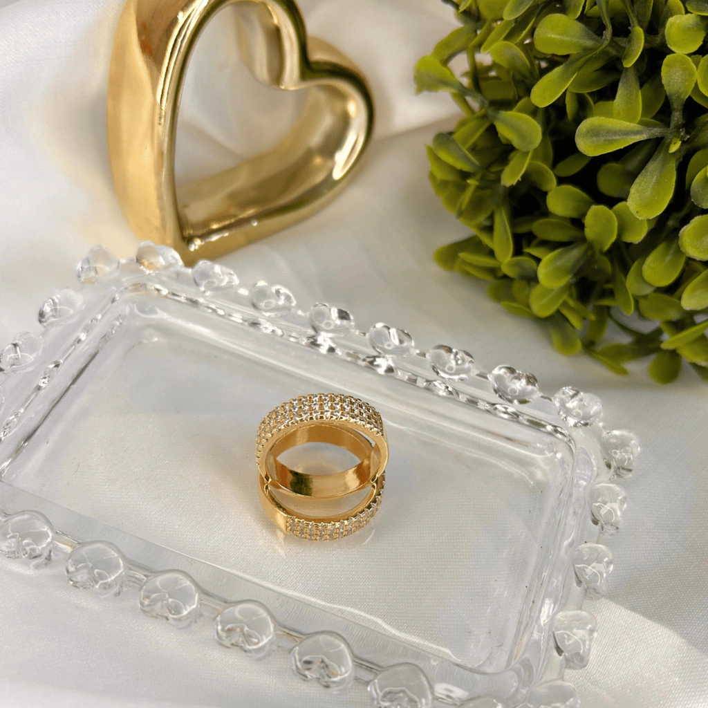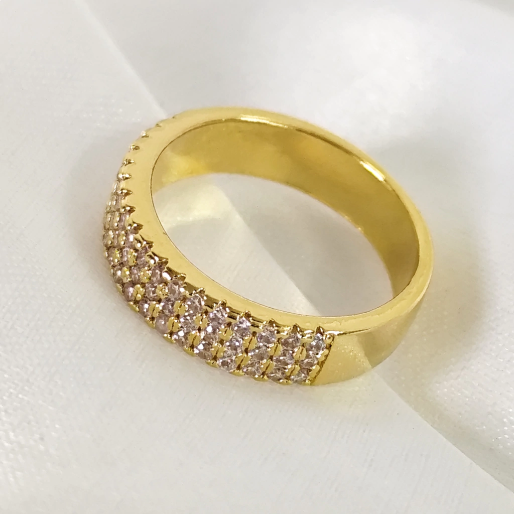 Descubra a beleza deste anel dourado, com três fileiras de zircônias. Ele um brilho intenso e duradouro, cada pedra é cuidadosamente cravejada, criando um efeito lindo. Ideal para ocasiões especiais ou para adicionar um toque de elegância ao seu look diário. Um verdadeiro símbolo de classe.