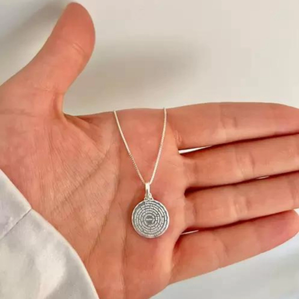 Colar com pingente medalha oração ''pai nosso'', em prata 925. Discreto e delicado, uma proteção diária para carregar junto ao seu coração. Temos certeza que você vai adorar. Acompanha correntinha veneziana V15 super delicada e resistente.