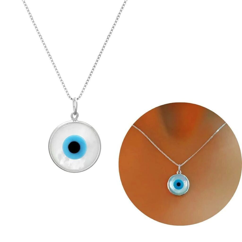 Lindo Colar com pingente de Olho Grego Azul claro Pequeno Material: Prata 925 com garantia vitalícia no teor do material e Pedra Sintética Comprimento: 40cm Corrente: Veneziana malha v15 (mais grossa) Modelo: V15 Olho Grego: 15mm (diâmetro) Pedra: Sintética Core: Azul claro Fecho: Boia
