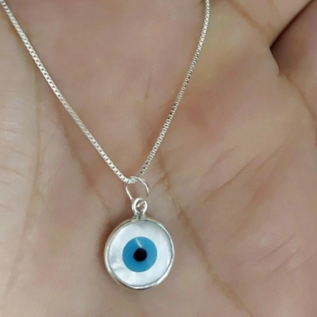 Lindo Colar com pingente de Olho Grego Azul claro Pequeno Material: Prata 925 com garantia vitalícia no teor do material e Pedra Sintética Comprimento: 40cm Corrente: Veneziana malha v15 (mais grossa) Modelo: V15 Olho Grego: 10mm (diâmetro) Pedra: Sintética Core: Azul claro Fecho: Boia