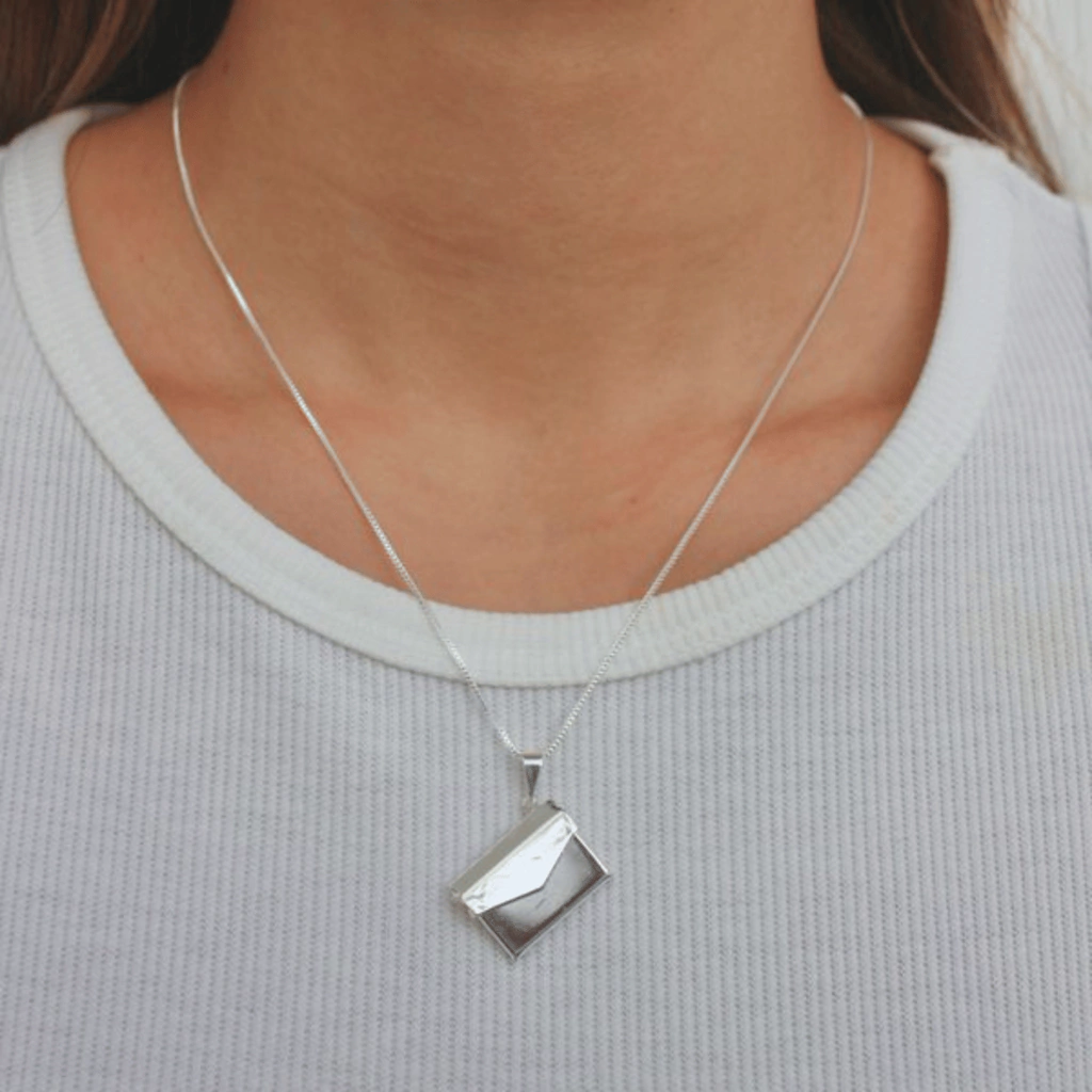 Um design encantador em formato de envelope, este relicário banhado a prata é perfeito para guardar até três fotos especiais. Carregue momentos inesquecíveis sempre perto de você, com muito estilo e significado. Um acessório único para quem valoriza afetividade e beleza.