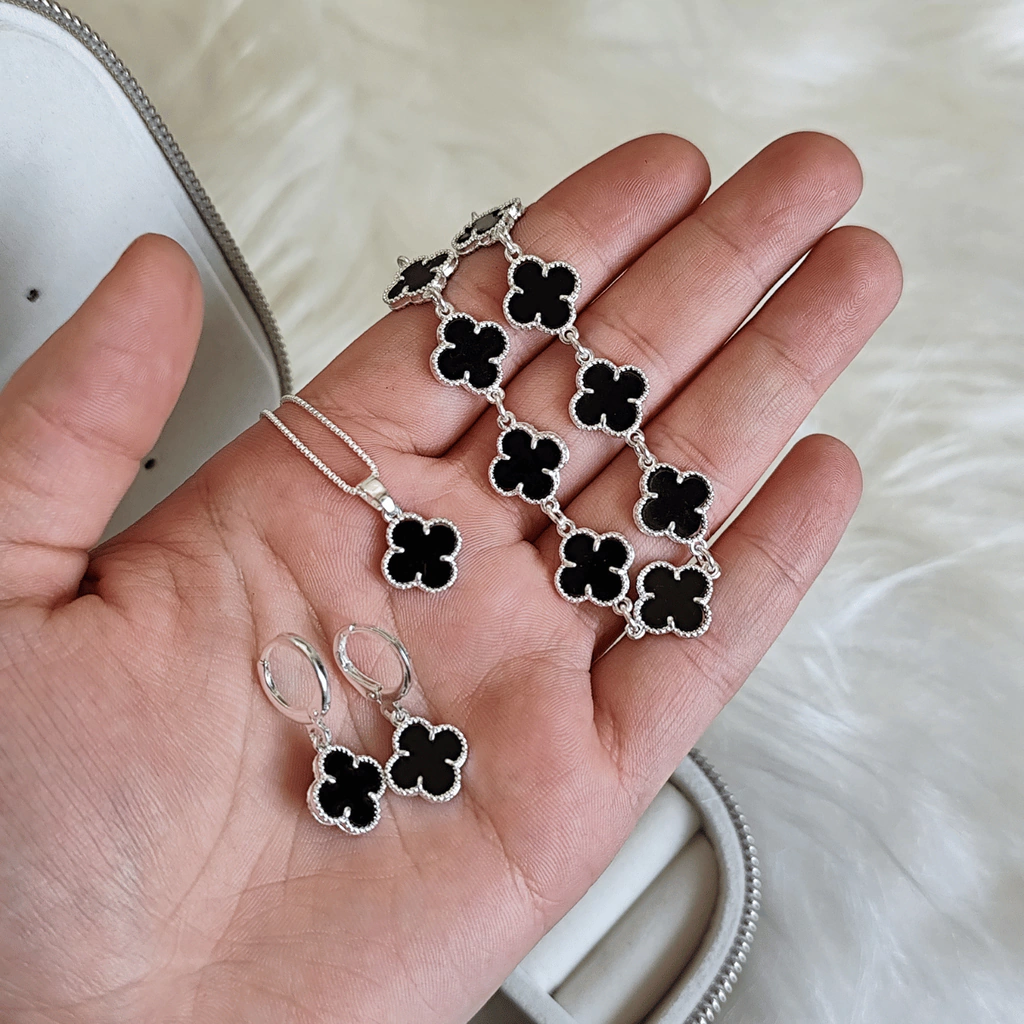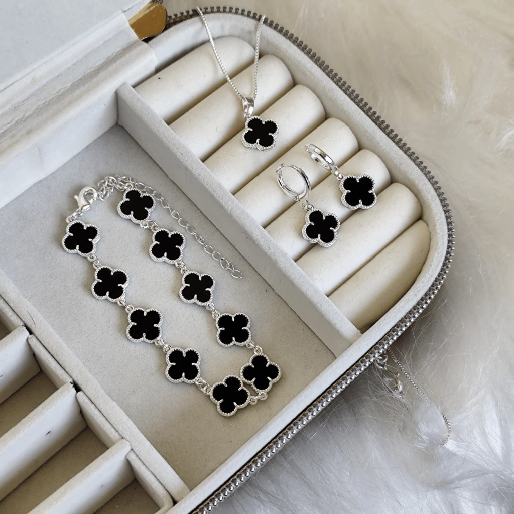 O Conjunto Trevo Preto em Prata 925, modelo Virginia, é a combinação perfeita de elegância e modernidade. Composto por brinco, pulseira e colar, cada peça é banhada e apresenta um design delicado que une sofisticação e estilo. Ideal para destacar seus looks com charme e versatilidade, é a escolha certa para quem busca acessórios de alta qualidade e acabamento impecável.