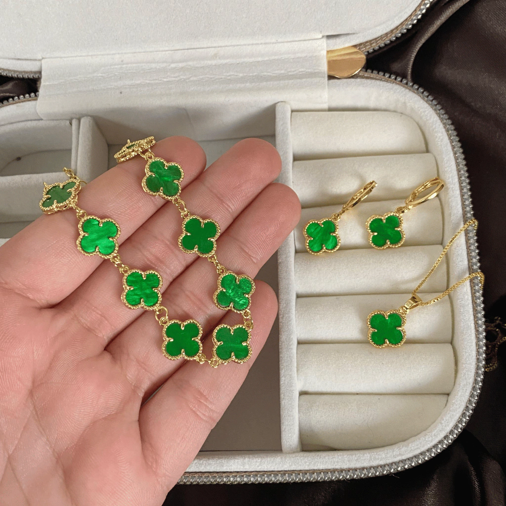 O Conjunto Ouro 18k Trevo Verde Modelo Virgínia Banhado é a escolha ideal para quem busca sofisticação e elegância em um só conjunto. Composto por brinco, pulseira e pingente, ele traz a simbologia do trevo, que representa sorte e proteção. O banho de ouro 18k, aliado ao verde vibrante, confere um toque de frescor e exclusividade. Este conjunto é perfeito para complementar qualquer look, seja no dia a dia ou em ocasiões especiais.