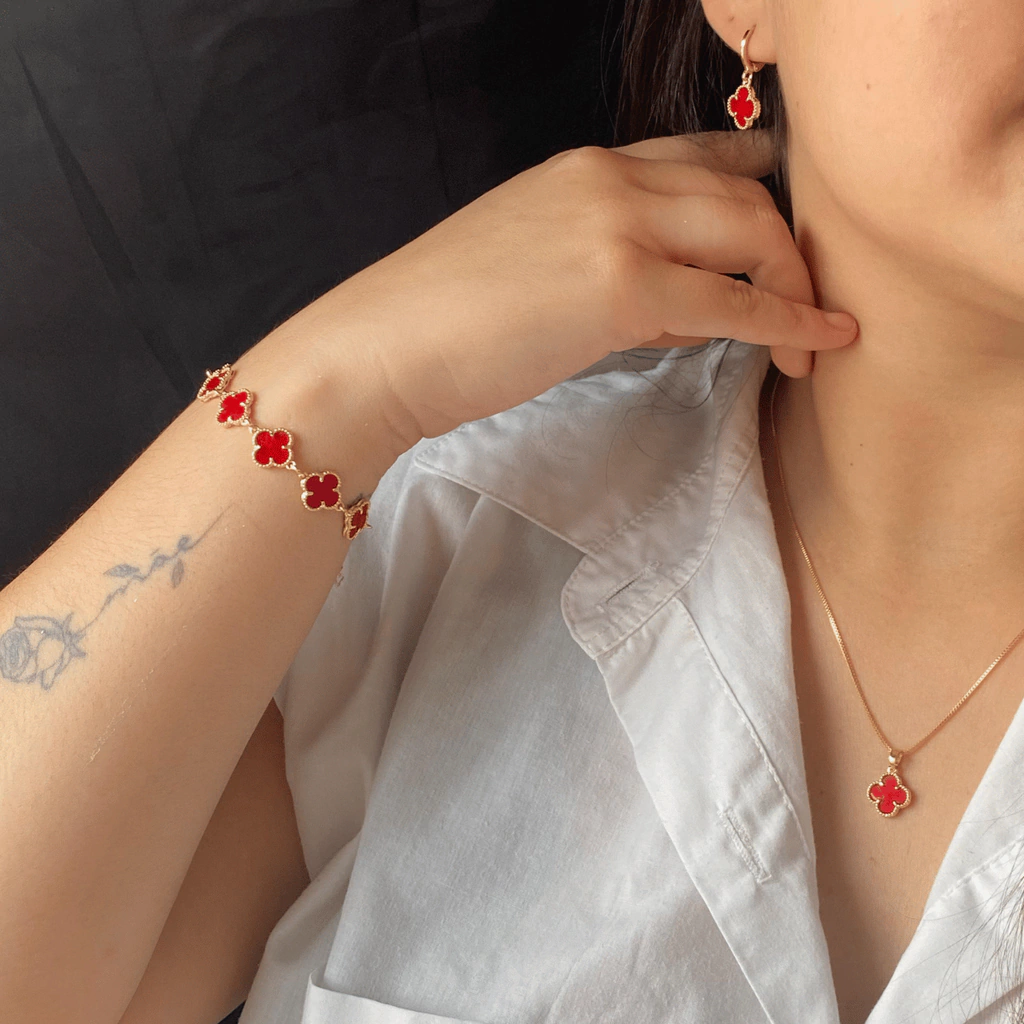 O Conjunto Trevo Ouro 18k Modelo Virgínia Banhado é a combinação perfeita de sofisticação e estilo. Composto por brinco, pulseira e colar, esse conjunto traz o design clássico do trevo, simbolizando sorte e elegância. O banho de ouro 18k e o acabamento preto proporcionam um visual moderno e versátil, ideal para qualquer ocasião.