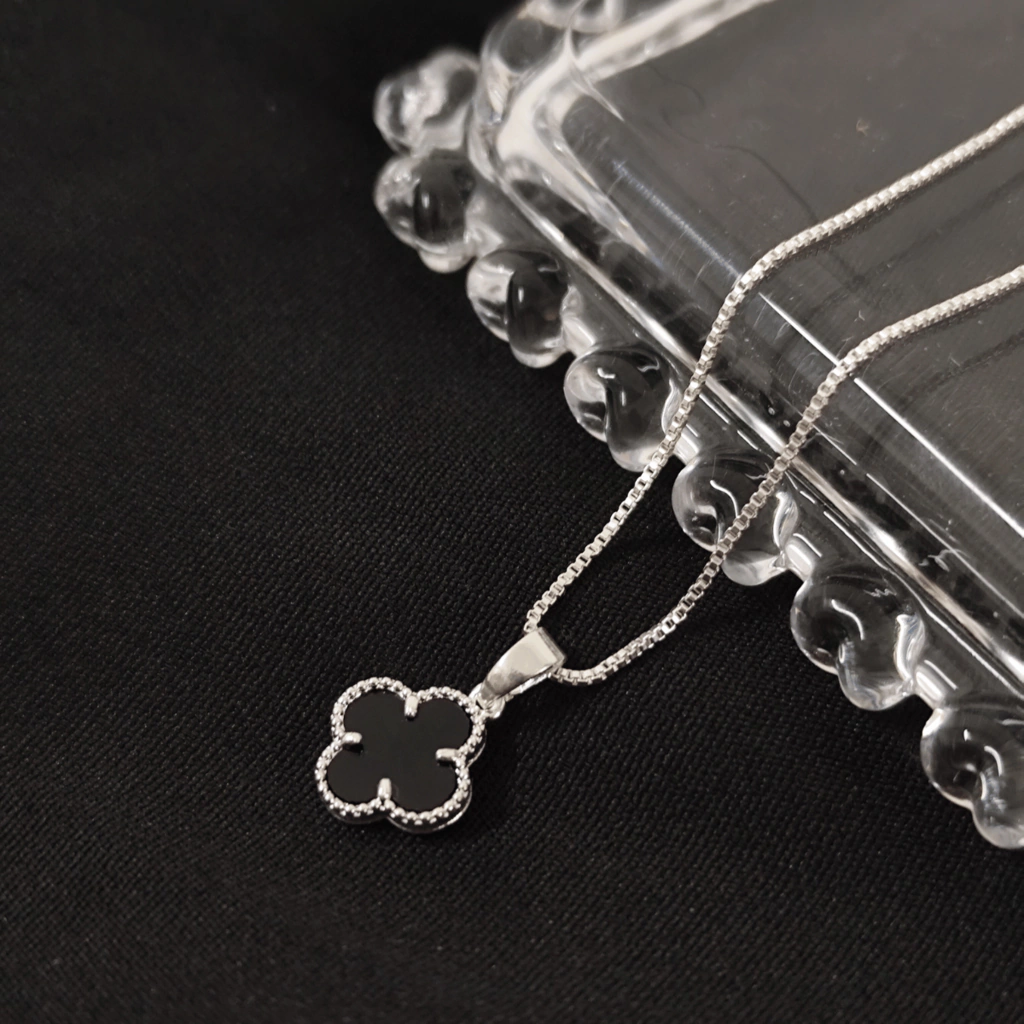 Trevo Preto banhado a prata, composto por uma corrente delicada e um pingente no formato de trevo. Inspirado no estilo do Modelo Virgínia, o conjunto traz um toque de sofisticação e simboliza sorte e elegância. Ideal para compor looks diários ou ocasiões especiais com um brilho sutil e versátil.