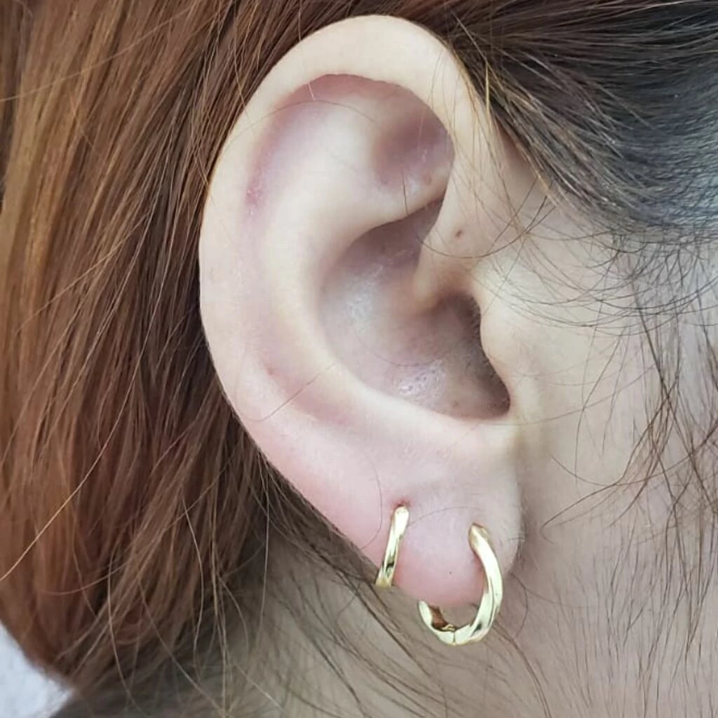 Linda dupla de argolinhas redondas, torcidas e delicadas, pequenas perfeitas para usar no primeiro e segundo furo e também junto com mix de brincos por ser neutra.