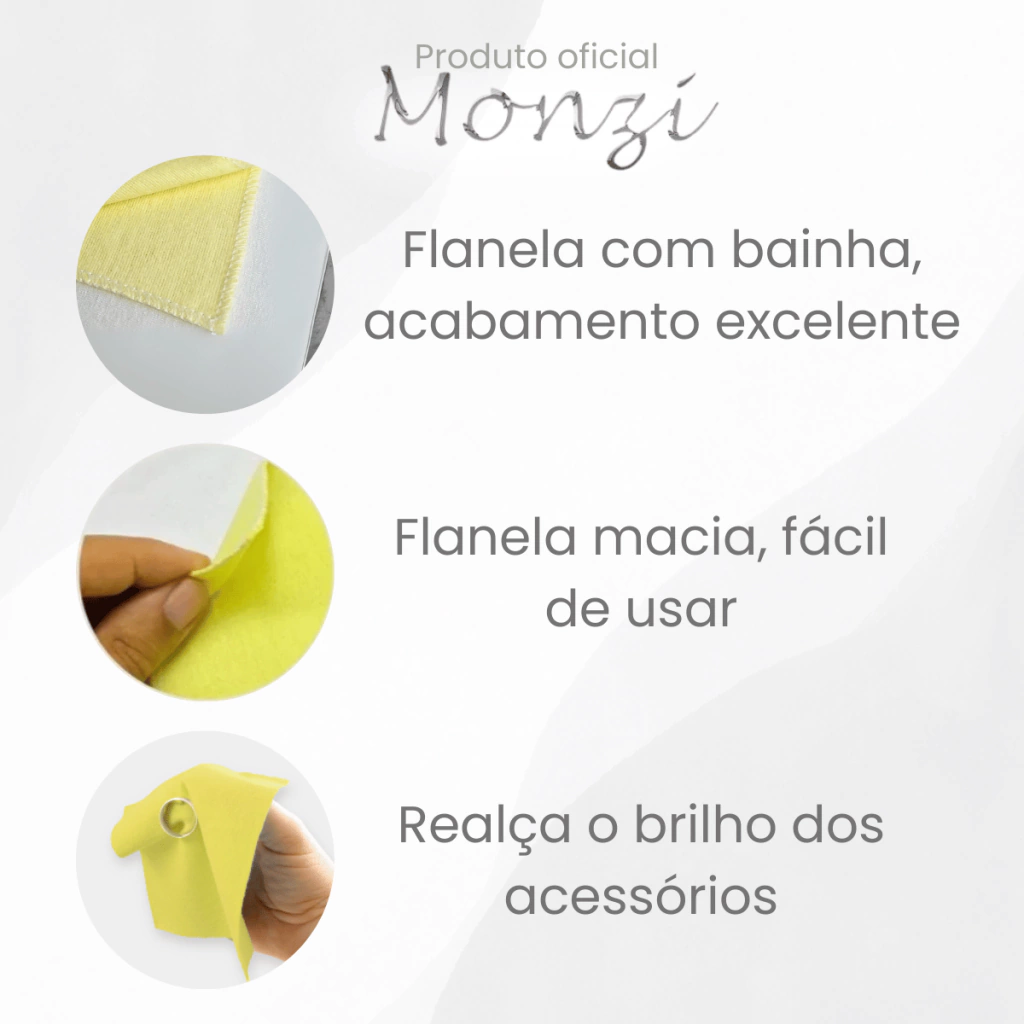 A Flanela Monzi é o produto ideal para manter suas joias de prata e acessórios sempre brilhantes e livres de impurezas. Com sua fórmula especial, garante uma limpeza eficaz e delicada, preservando a beleza e o brilho das peças. Seu material de alta qualidade e praticidade para multiplos usos tornam o produto indispensável para quem valoriza a durabilidade e o cuidado com suas joias. Garanta o seu e mantenha suas joias sempre impecáveis.