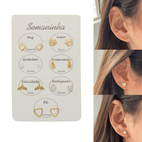Kit com 7 brincos, pensado para acompanhar você todos os dias da semana! As peças, banhadas a ouro 18k, oferecem estilo para o uso diário. Com design antialérgico, proporcionam conforto e proteção, sendo a escolha ideal para quem busca praticidade e elegância no cotidiano.