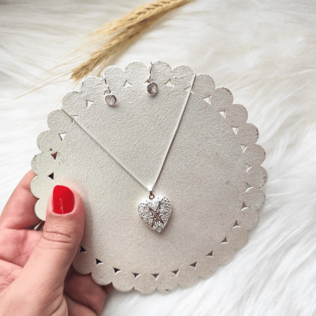 Relicário delicado, charmoso e perfeito para compor seu look com estilo e afetividade, junto de um brinco incrível de coração cravejado com fecho click, ambos banhados em prata 925. O relicário é banhado e as fotos que o acompanham são cortesia!