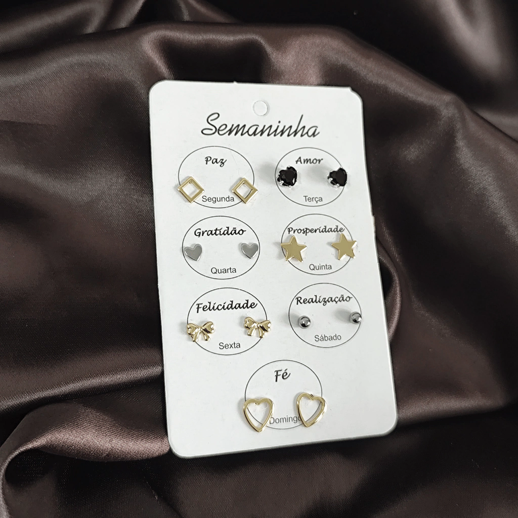 Semaninha de 7 brincos banhados a ouro 18k, perfeita para usar um em cada dia da semana. Oferecem elegância e versatilidade, garantindo estilo de segunda a domingo. Totalmente antialérgicos, são ideais para quem busca conforto e sofisticação no dia a dia.