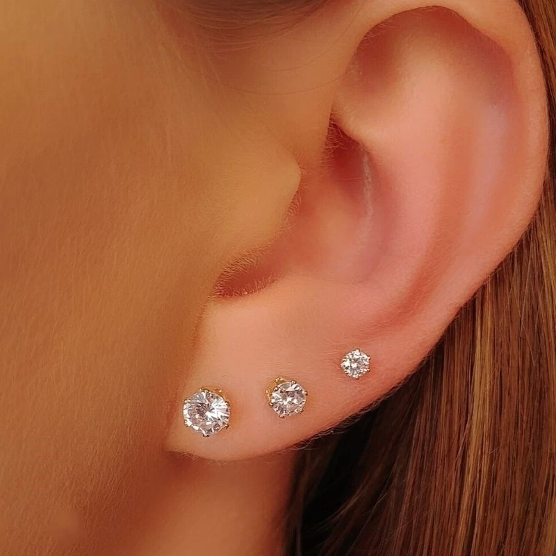 trio de brincos de zircônia redondos banhado em ouro 18k antialérgico delicado ideal para o seu dia a dia com 6 meses de garantia.